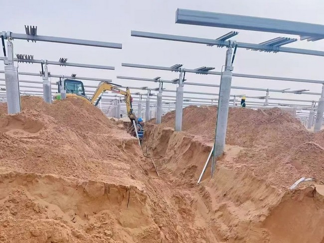 阻止2025年3月,,,,,,,,履历了早期的场平、打混凝土桩基后,,,,,,,,现在项目已进入要害攻坚阶段,,,,,,,,Stake官网新能源团队重点推进低压共沟开挖与配套建设、光伏组件装置质量及清静检查、 高压电缆整理进箱与集成线路盘留等阶段事情,,,,,,,,以坚实推进项目早日乐成并网发电: